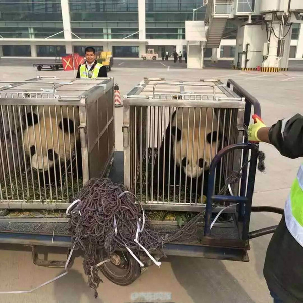 陪伴两只国宝来河南的四川成都大熊猫繁殖研究基地工作人员介绍,3月18日凌晨3点多,两只宝贝就“起床”了;4点多进入笼子,乘车离开熊猫基地;5点多到达成都双流机场,过了安检后进入转运动仓库等待登机。早晨7点20分,两只熊猫乘坐的专用飞机起飞,长途跋涉千余公里,于9点20分安全抵达新郑机场。随后乘坐龙潭大峡谷专门打造的熊猫车前往洛阳。下午两点,熊猫专车在交警和花车的护送下来到龙潭大峡谷景区。