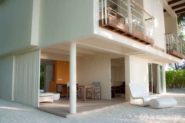 这里的建筑群像一个个巨形蘑菇置于岛上,设计灵感是来自海洋中的蘑菇形珊瑚。而度假村的房间许多都是复式,设施齐全得让你忘记了这是避世天堂。比如,Illy咖啡粉、斯里兰卡高级Dilmah茶叶、面包机等等。甚至每天都送上6个新鲜橙子,让你好好动手用榨汁机做橙汁。这里的确有别于马尔代夫的那些原味住宿,也许更加符合年轻人的口味,但其创意和体贴的服务都值得你去体验。如果是情侣共度的话,这里绝对能给他们一个大大的惊喜!
